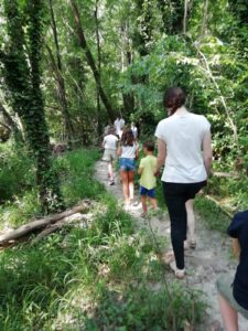 una quarantina tra ragazzi, bambini ed operatori della nostra parrocchia dalla Chiesa parrocchiale al Santuario sul Colle Castellaro attraverso il sentiero natura della Valle delle Ru, ideato da me molti anni fa e splendidamente realizzato dal Comune e da tanti volontari. Circa 7 km. Comprende anche due km preparati tra boschi e ruscelli, bellissimo, per persone con difficoltà di deambulazione.